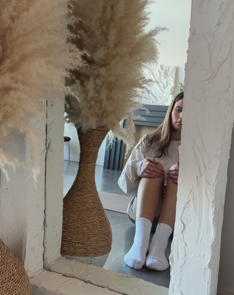 Stability and safety with a dash of positive affirmation, our 100% cotton ankle-length socks will have you confidently moving through any class with ease. Equipped with non-slip PVC grips on the sole, these socks provide traction to prevent sliding on studio floors and equipment. Perfect for reformer pilates, yoga, and barre classes.